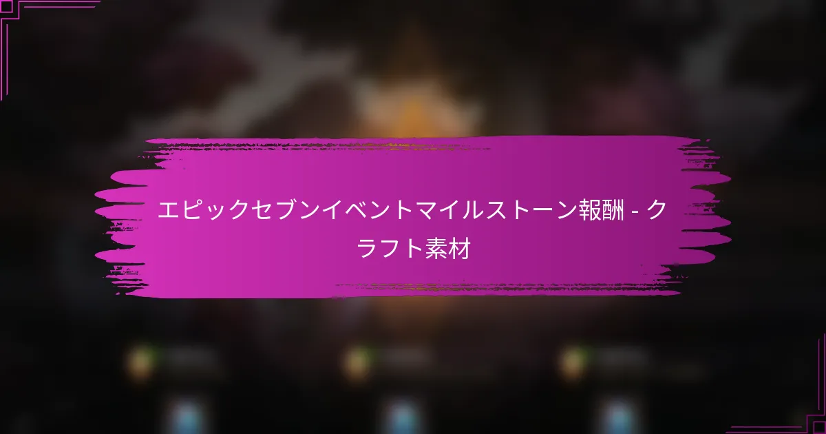 Epic Sevenイベントのマイルストーン報酬は、プレイヤーにゲームプレイ体験を向上させるさまざまな報酬を提供します。特定のゲーム内アクティビティに参加することで、プレイヤーは装備の作成やアップグレードに必要な重要な素材を獲得できます。これらの報酬を最大限に活用するためには、戦略的な計画と効率的なリソース管理が重要です。 Epic Sevenイベントのマイルストーン報酬には何がありますか? Epic Sevenイベントのマイルストーン報酬には、プレイヤーが特定のゲーム内アクティビティに参加することで得られるさまざまな報酬が含まれています。これらの報酬は、装備の作成やアップグレードに必要な重要な素材を提供することで、ゲームプレイを向上させることを目的としています。 イベント中に利用可能なマイルストーン報酬の概要 Epic Sevenイベント中、プレイヤーはタスクを完了し、特定の目標に到達することでいくつかのマイルストーン報酬を達成できます。これらの報酬には、通常、作成素材、限定アイテム、さまざまな目的に使用できるゲーム内通貨が含まれます。 神秘のメダルや強化石などの作成素材 イベントテーマの限定装備やアクセサリー ゴールドやスカイストーンなどのゲーム内通貨 各マイルストーンに到達することで新しい報酬がアンロックされ、プレイヤーはイベントのアクティビティにより深く関与することが奨励されます。報酬の多様性は、プレイヤーがイベント期間中に参加するための複数のインセンティブを提供します。 マイルストーンを通じて得られる作成素材の種類 プレイヤーはイベントのマイルストーンを通じて、ヒーローや装備を強化するために重要なさまざまな作成素材を得ることができます。作成素材には、一般的なアイテムと希少なアイテムの両方が含まれます。 …