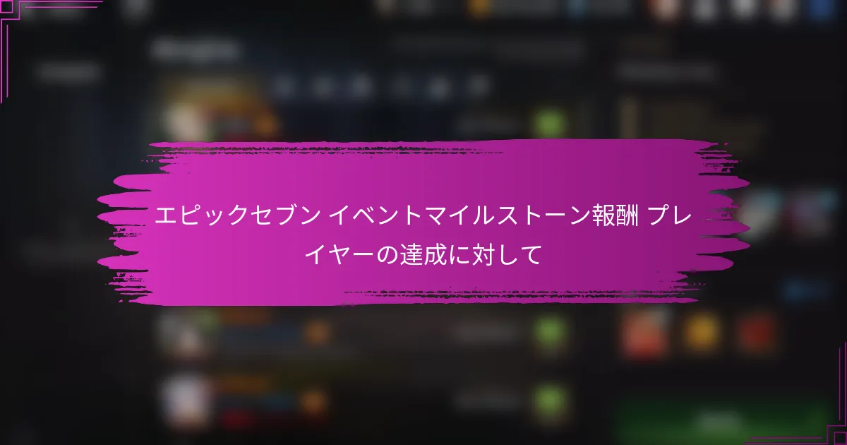今後のEpic Sevenイベントでは、キャラクターの外見やゲームプレイを向上させる独占スキンを含むエキサイティングなマイルストーン報酬が用意されています。特定のタスクを完了し、設定されたマイルストーンに到達することで、プレイヤーはこれらのユニークなコスメティックアップグレードをアンロックできます。進捗を最大化するためには、イベントタスクを優先し、チーム構成を最適化し、ゲーム内リソースを効果的に管理することが重要です。 今後のEpic Sevenイベントではどのようなマイルストーン報酬が提供されますか? 今後のEpic Sevenイベントでは、独占スキンを含むマイルストーン報酬が用意されています。プレイヤーは、イベント期間中に特定のタスクを完了し、設定されたマイルストーンに到達することでこれらの報酬を獲得できます。 イベントの日程と期間 イベントは数週間にわたって開催される予定で、通常は約2〜4週間続きます。各イベントには明確な開始日と終了日が設定されており、プレイヤーは参加を最大化するためにこれらの日付を把握しておく必要があります。 例えば、イベントが月曜日に始まる場合、月の最終日曜日に終了することがあります。これらの日付を追跡することは、プレイヤーが利用可能な時間内にすべての必要なタスクを完了できるようにするために重要です。 マイルストーン達成基準 マイルストーン報酬を得るためには、プレイヤーはイベントによって設定された特定の達成基準を満たす必要があります。これらの基準には、特定の参加レベルに達することや、指定されたタスクを完了することが含まれることが多いです。 特定の数のバトルを完了する。 一定量のゲーム内通貨やアイテムを収集する。 コミュニティイベントやチャレンジに参加する。 各マイルストーンは通常異なる報酬を提供するため、プレイヤーはイベントの目標に合ったタスクを優先するべきです。 …